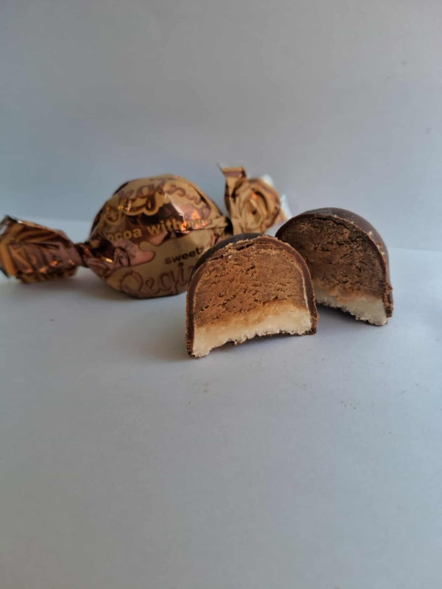 Обвит в медно-кафяво фолио, този бонбон е обещание за фина, многопластова наслада. Той съчетава класическия шоколад с изненадващо лек и въздушен център.