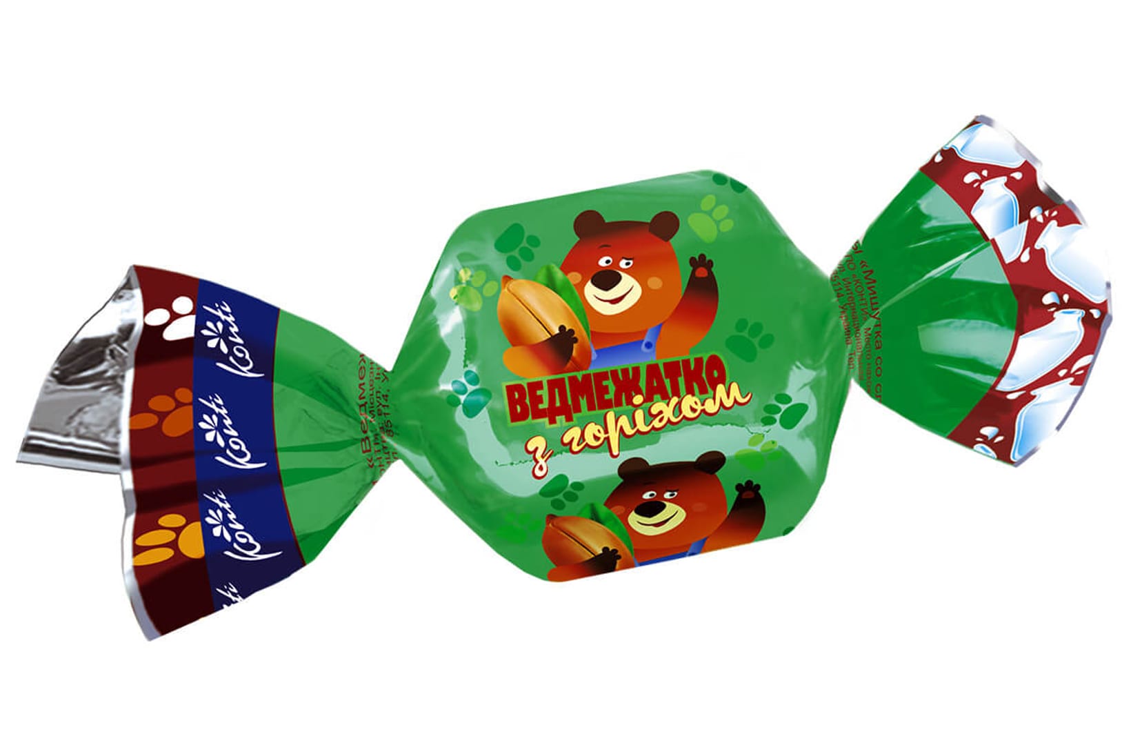 Шоколадов бонбон с млечен пълнеж и натрошени ядки, подходящ за деца.